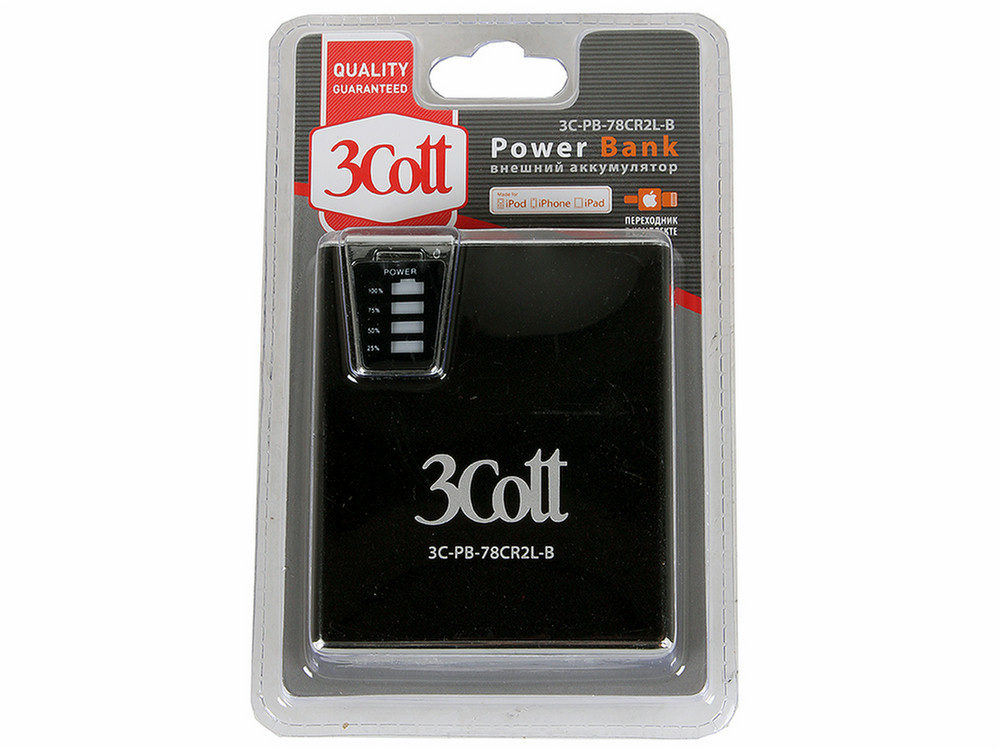 3Cott 3C-PB-78CR2L-B. Produktfarbe: Schwarz, Aufladekompatibilität: Smartphone, Tablet, Kompatibilität: Phone 5/4, iPad 3/4, Nokia Lumia, Samsung Galaxy, Galaxy Note, Sony Xperia Z, HTC One, LG Nexus, Opt. Batteriekapazität: 7800 mAh, Aufladequelle: DC, Energieschutzeigenschaften: Battery discharge, Overdischarge, Kurzschluss. Breite: 70 mm, Tiefe: 80 mm, Höhe: 20 mm. Mitgelieferte Kabel: AC
