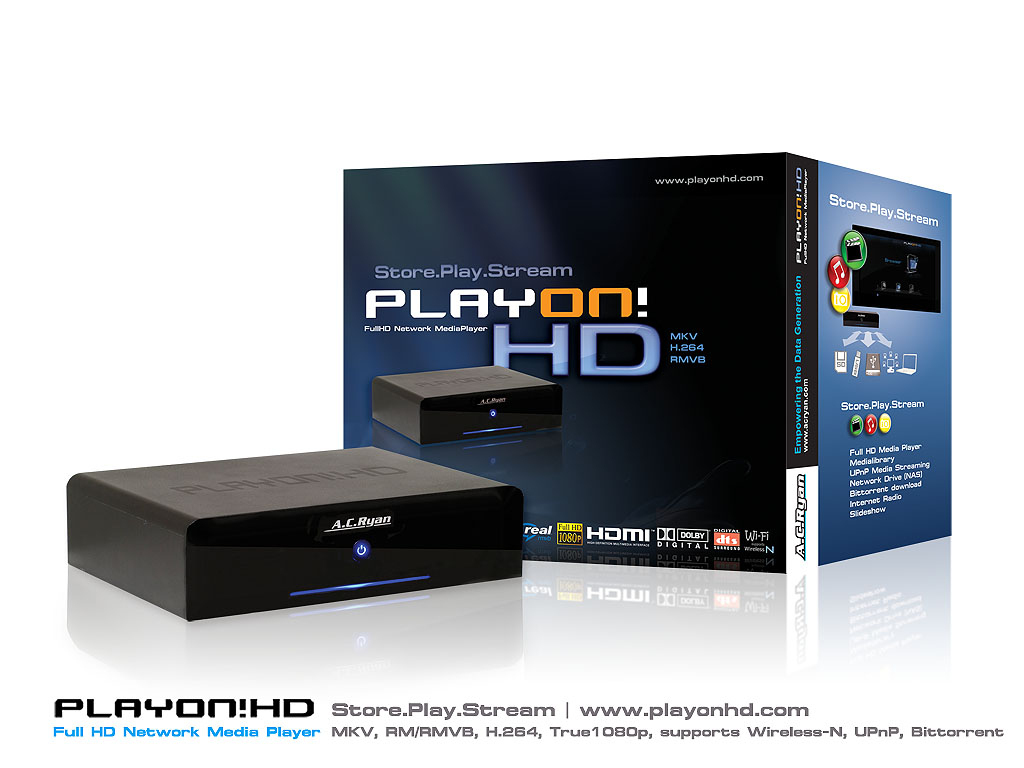 AC Ryan Playon!HD 500GB. Produktfarbe: Schwarz. Speichermedien Typ: Festplatte, Gesamtspeicherkapazität: 500 GB, Größe des Speicherlaufwerks: 3.5 Zoll. Unterstützte Videoformate: H.264,MKV,RM,RMVB, Untertitelformate unterstützt: SMI,SRT,SSA,SUB. Breite: 227 mm, Tiefe: 165 mm, Höhe: 60 mm. Laufwerk, Puffergröße: 300 MB, Typ: Desktop, Übertragungstechnik: Verkabelt & Kabellos
