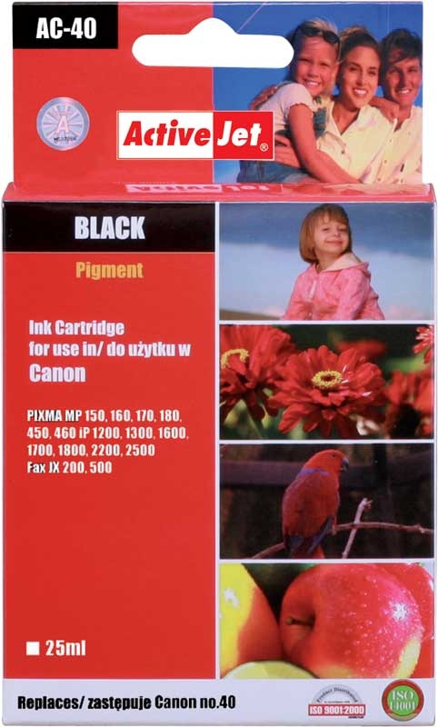 ActiveJet AC-40. Druckfarben: Schwarz, Kompatible Produkte: (Canon) Fax: JX 200, JX 500. (Canon) PIXMA: iP1200, iP1300, iP1600, iP1700, iP1800, iP1900, iP2200, , Drucktechnologie: Tintenstrahl