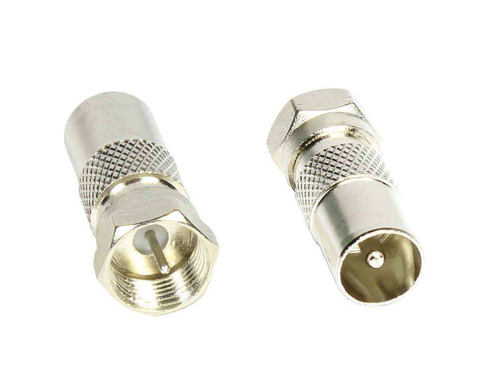 Adapter von F-Stecker auf Koax Stecker. Hiermit lässt sich das normale Antennenkabel z.B. auch an den SAT-Receiver anschließen.