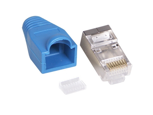 Modularstecker zum selber-konfektionieren von Patchkabeln. Der Stecker besteht aus drei Teilen, nämlich Stecker, Kabelführungskamm und der Knickschutztülle. - Geschirmter Modularstecker Cat. 5e - Mit Kabelführungskamm und Knickschutztülle - Farbe: blau