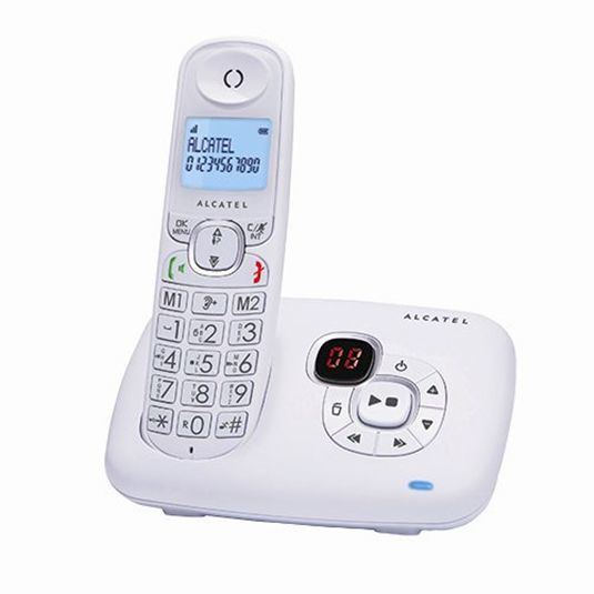 Alcatel Confort XL 375 Voice Solo. Typ: DECT, Aufnahmezeit: 15 min, Maximum Innenabstand: 50 m. Befestigungstyp: Tisch/Bank, Produktfarbe: Weiß. Telefonbuch Kapazität: 50 Eintragungen. Farbe der Hintergrundbeleuchtung: Blau. Akku-/Batterietyp: AAA, Gesprächszeit: 10 h, Bereitschaftszeit: 100 h