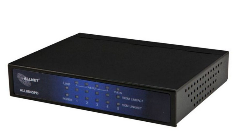 Der ALL8845PD Switch ist der erste PoE Switch aus dem Hause ALLNET der sowohl seinen eigenen Betriebsstrom über Power over Ethernet bezieht, als auch in der Lage ist, bis zu vier PoE fähige Endgeräte über den Netzwerkkabel mit Daten und Strom zu versorgen! Die Leitungslänge kann bis zu 100 Meter zum ALL8845PD und weitere 100 Meter vom ALL8845PD zum Endgerät betragen. Dies sorgt für eine nie gekannte Freiheit und Fexibilität bei der Installation. Speziell für die Anbindung von IP-Kameras und WLAN Access Points ist der ALL8845PD die ideale Lösung.