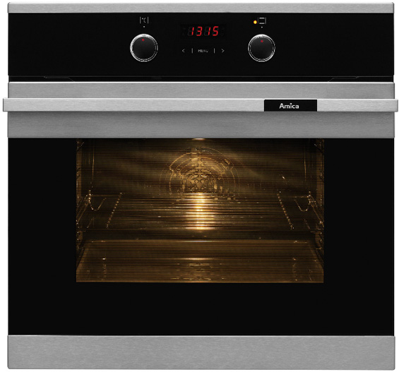 Amica TEF1534AA. Ofentyp: Electric oven, Gesamtes Fassungsvermögen Garraum Ofen: 66 l, Insgesamt Backofen Leistung: 3100 W. Produktfarbe: Edelstahl, Kontrolltyp: Rotation, Integrierte Uhr: Elektronisch. Energie-Effizienzklasse: A. Breite: 595 mm, Tiefe: 575 mm, Höhe: 595 mm