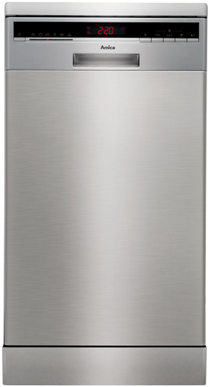 Amica ZWM 446 IE. Typ: Freistehend, Türfarbe: Edelstahl, Bedienfeld Farbe: Schwarz, Edelstahl. Anzahl der Gedecke: 10 Stellen, Geräuschpegel: 45 dB, Trocknung Kategorie: A. Energie-Effizienzklasse: A+, Energieverbrauch pro Zyklus: 0,83 kWh, Wasserverbrauch pro Zyklus: 9 l. Breite: 448 mm, Tiefe: 600 mm, Höhe: 845 mm