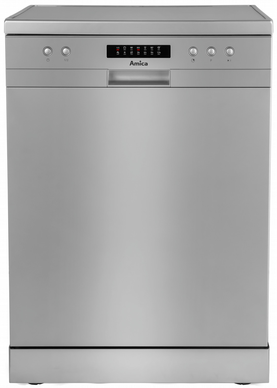 Amica ZWM 636SD. Typ: Freistehend, Türfarbe: Edelstahl, Bedienfeld Farbe: Edelstahl. Anzahl der Gedecke: 12 Stellen, Geräuschpegel: 49 dB, Trocknung Kategorie: A. Körbe anpassbare Platzierung: höher, Farbe der Hintergrundbeleuchtung: Rot. Energie-Effizienzklasse: A++, Energieverbrauch pro Zyklus: 0,91 kWh, Wasserverbrauch pro Zyklus: 11 l. Breite: 598 mm, Tiefe: 600 mm, Höhe: 845 mm