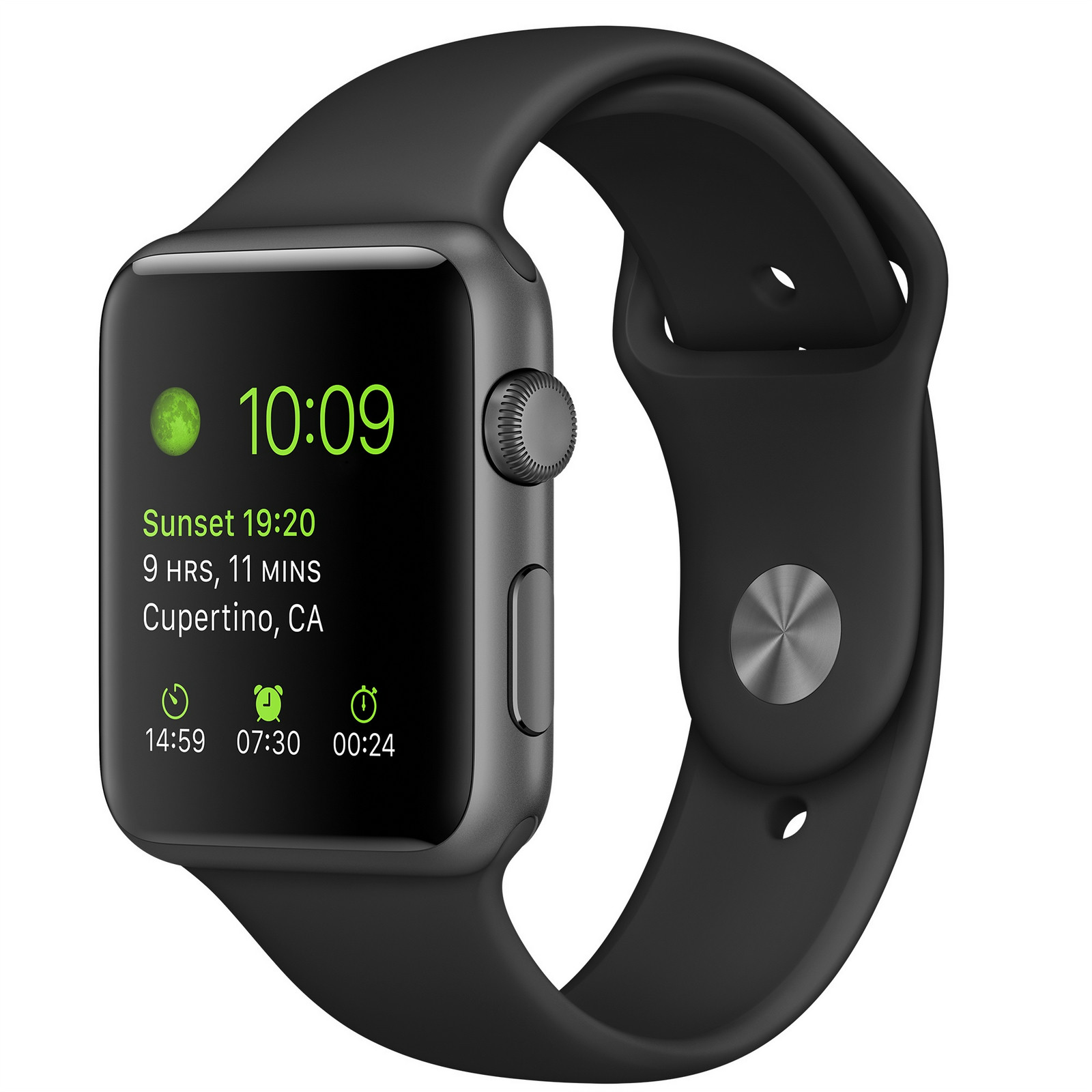 Apple Watch Sport. Gehäusefarbe: Grau, Gehäusematerial: Aluminium, Armbandfarbe: Schwarz. RAM capacity: 512 MB, Flash-Speicher: 8 GB. WLAN-Standards: 802.11b,802.11g,802.11n. Batterietechnologie: Lithium-Ion (Li-Ion), Batterielebensdauer: 18 h. Breite: 35,9 mm, Tiefe: 42 mm, Dicke: 1,05 cm