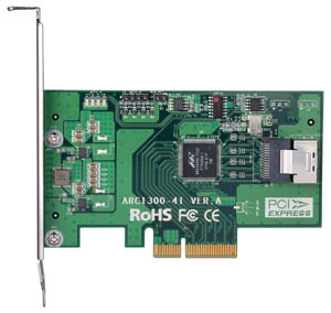 Areca ARC-1300-4I. Hostschnittstelle: PCIe. Zertifizierung: RoHS. Tiefe: 65 mm, Höhe: 113 mm. Kompatible Betriebssysteme: Windows Vista/2003/XP/2000/Red Hat Linux/SuSE /Fedora Core/Mac OS X 10.4.X/10.5/Leopard/BSD/FreeBSD/
