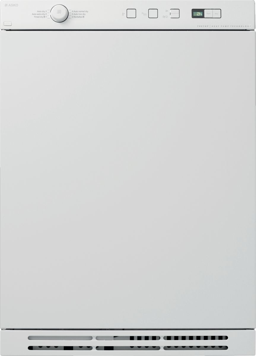 Asko T857HPW. Bauform: Freistehend, Ladetyp: Frontlader, Trocknungssystem: Hitzepumpe. Trommelkapazität: 8 kg, Trocknung Kategorie: A, Zykluszeit: 180 min. Einschaltsverzögerung: 24 h. Energie-Effizienzklasse: A+++, Anschlusswert: 800 W, Nennstrom: 10 A. Breite: 595 mm, Tiefe: 630 mm, Höhe: 845 mm