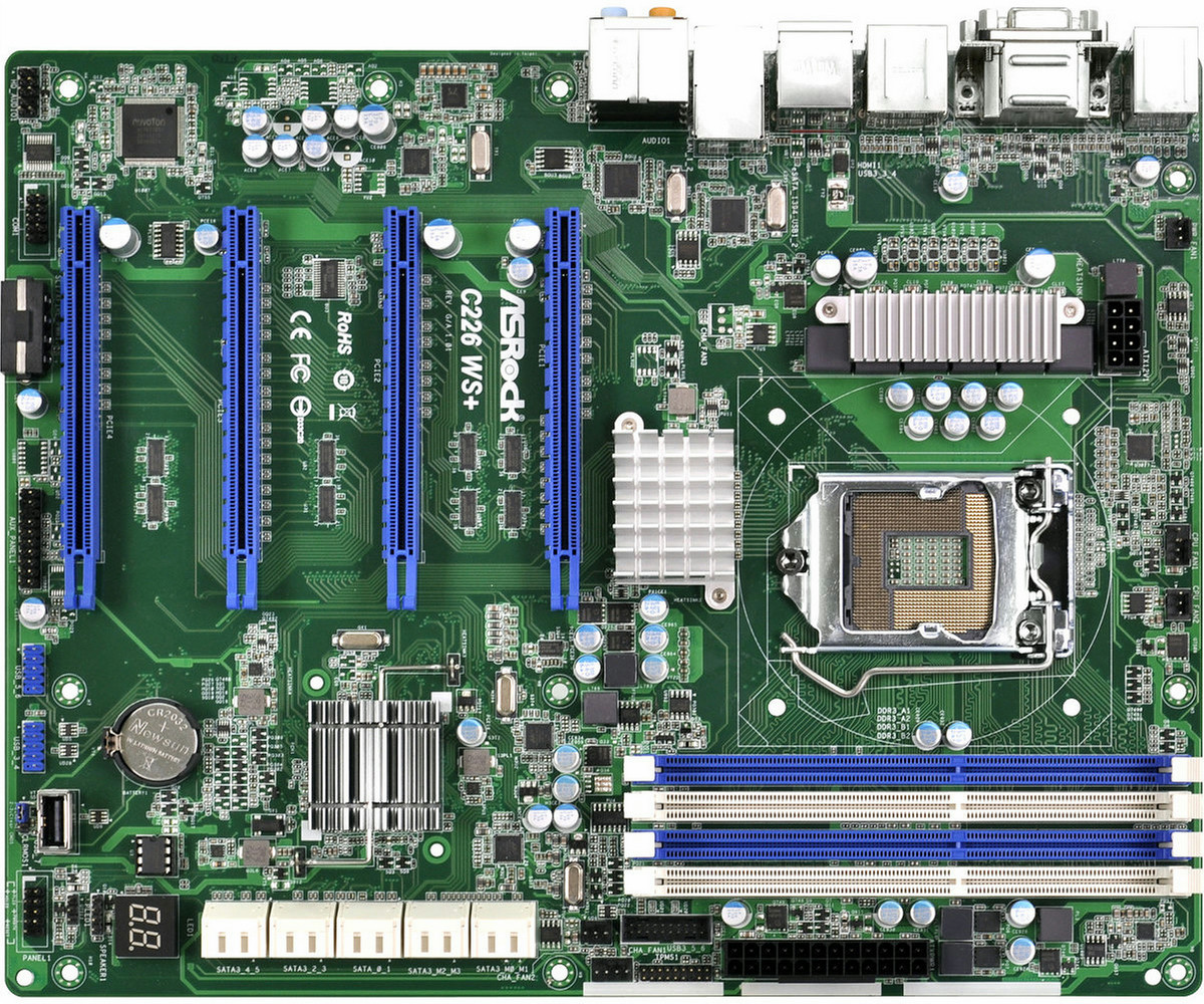 Asrock C226 WS+. Motherboardformfaktor: ATX. Prozessorhersteller: Intel, Prozessorsockel: LGA 1150 (Socket H3), Intel® Xeon-Serie: E3-1200. Unterstützte Arbeitsspeicher: DDR3-SDRAM, Unterstützte Arbeitsspeichergeschwindigkeit: 1333,1600 MHz, RAM-Speicher maximal: 32 GB. Festplatten-Schnittstelle: Serial ATA III, RAID Level: 0, 1, 5, 10. Motherboard Chipsatz: Intel C226