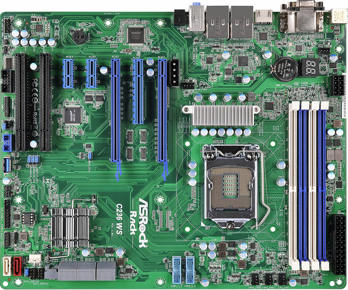Asrock C236 WS. Motherboardformfaktor: ATX. Prozessorhersteller: Intel, Prozessorsockel: LGA 1151 (Socket H4), Intel® Xeon-Serie: E3-1200. Unterstützte Arbeitsspeicher: DDR4-SDRAM, Unterstützte Arbeitsspeichergeschwindigkeit: 2133 MHz, RAM-Speicher maximal: 64 GB. Festplatten-Schnittstelle: Serial ATA III. Motherboard Chipsatz: Intel C236