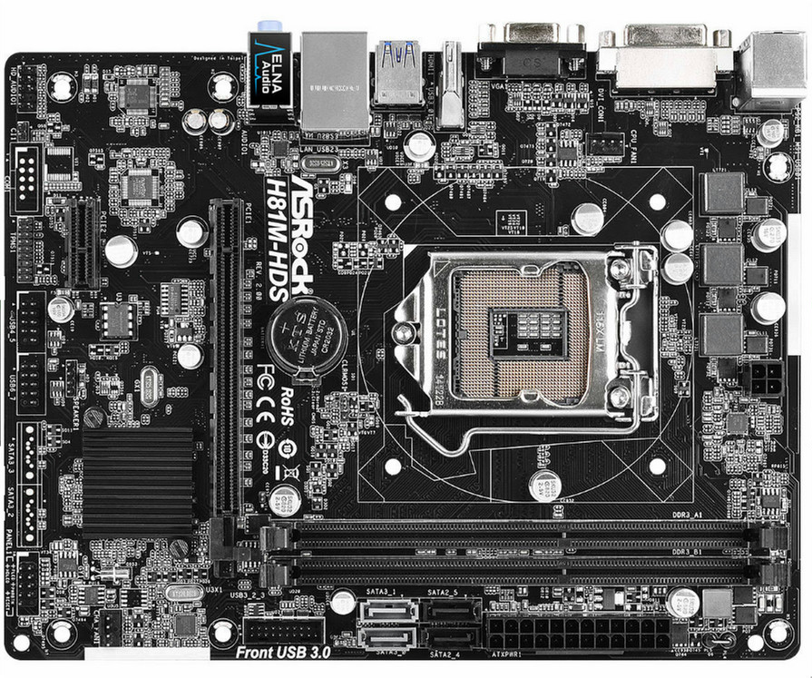 Asrock H81M-HDS R2.0. Unterstützte Arbeitsspeicher: DDR3-SDRAM,DDR3L-SDRAM, Arbeitsspeicher Typ: DIMM, Unterstützte Arbeitsspeichergeschwindigkeit: 1066,1333,1600 MHz. Prozessorfamilie: Intel, Kompatible Prozessoren: Celeron,Core i3,Core i5,Core i7,Core i7 Extreme Edition,Pentium,Xeon, Prozessorsockel: LGA 1150 (Socket H3). Unterstützte Speicherlaufwerk-Schnittstellen: Serial ATA II, Serial ATA III. LAN-Controller: Realtek RTL8111GR, Ethernet Schnittstellen Typ: Schnelles Ethernet, Gigabit Ethernet. Komponente für: PC, Motherboard Chipsatz Familie: Intel, Motherboard Chipsatz: Intel H81