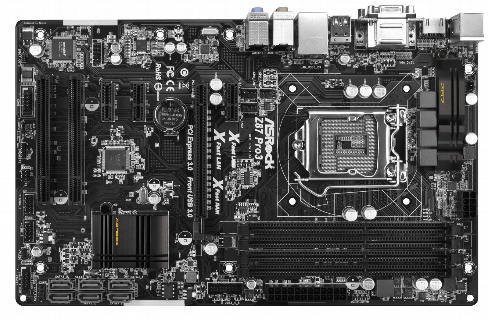 Asrock Z87 Pro3. Unterstützte Arbeitsspeicher: DDR3-SDRAM, Arbeitsspeicher Typ: DIMM, Unterstützte Arbeitsspeichergeschwindigkeit: 1066,1200,1300,1333,1500,1600,1666,1800,1866,1900,2000,2100,2133,2200,2250,2400,2450,2600,2666,2800 MHz. Prozessorfamilie: Intel, Kompatible Prozessoren: Celeron,Core i3,Core i5,Core i7,Pentium, Prozessorsockel: LGA 1150 (Socket H3). Unterstützte Speicherlaufwerk-Schnittstellen: SATA, Serial ATA II, Serial ATA III. Ethernet Schnittstellen Typ: Schnelles Ethernet, Gigabit Ethernet. Komponente für: PC, Motherboard Chipsatz Familie: Intel, Motherboard Chipsatz: Intel Z87