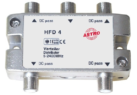 4-fach Verteiler 5-2400 MHZ, HFD mit Gleichstromdurchgang zu einem Anschluss. Power Pass 24 V 0,5 A max.