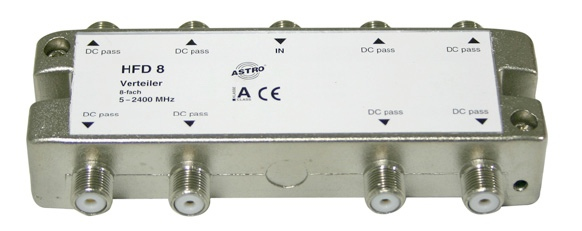 8-fach Verteiler 5-2400 MHZ, HFD mit Gleichstromdurchgang zu einem Anschluss. Power Pass 24 V 0,5 A max.