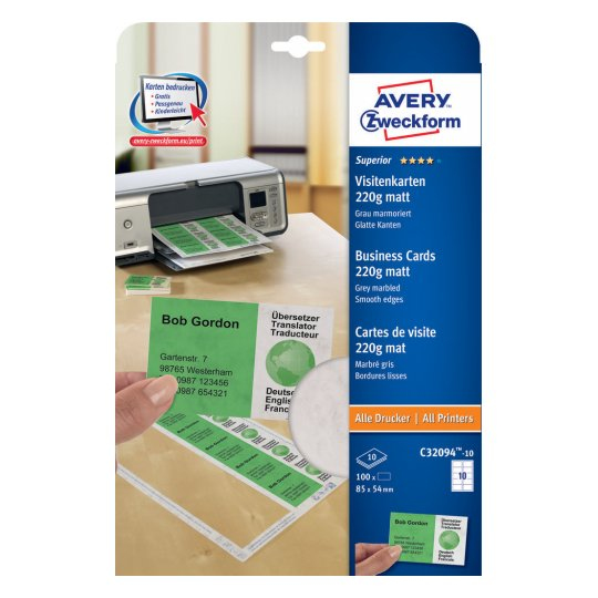 Die marmorierten, hellgrauen Superior Visitenkarten C32094-10 von AVERY ZWECKFORM im Format 85x54 mm garantieren exzellente Druckqualität auf allen gängigen Druckertypen. 100 Visitenkarten auf 10 Bogen. Die marmorierte, einseitig bedruckbare Visitenkarte, mit einer Grammatur von 220 g/m², hat dank patentierter Quick&Clean™ Technologie absolut glatte Kanten.