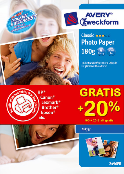 Mit den Classic Inkjet-Photo-Papieren von Avery Zweckform haben Sie für jeden Anlass das richtige Photopapier. Für alle Bilder egal ob vom Scanner, Digitalkamera oder Photo-CD. Für Bilder wie aus dem Photo-Labor. 180g, glänzend.