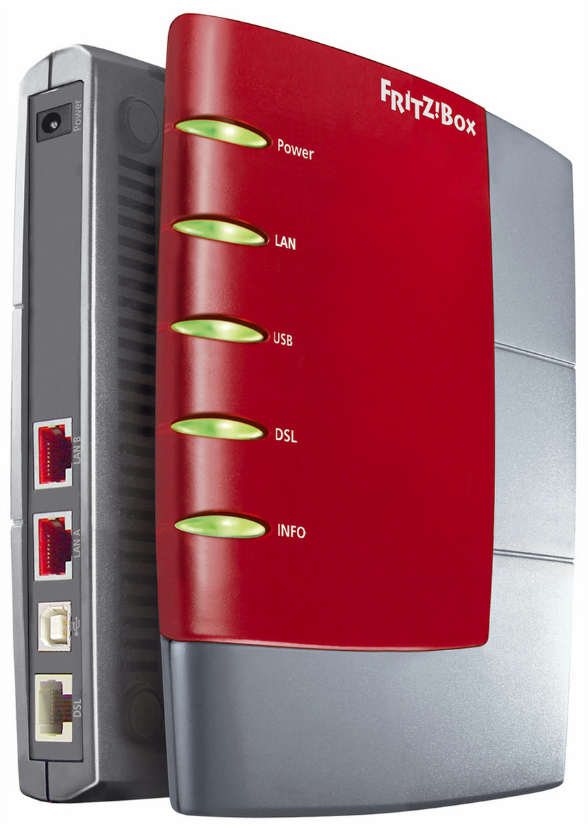 AVM FRITZ!Box ADSL Router (Annex A). Data Link Protokolle: Ethernet, Fast Ethernet, Unterstützte Protokolle: T-DSL, Arcor DSL,ITU G.992.1 Annex A, T-Com 1TR112 (UR-2). Gewicht: 250 g. Max. Datenübertragungsrate: 0,1 Gbit/s, Abmessungen (BxTxH): 160 x 122 x 31 mm, Kompatible Betriebssysteme: Windows XP, 2000, Me or 98; Linux (SuSE 9.0), MacOS X (10.3.3 +)