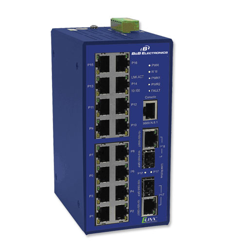 B&B Electronics EIR418-2SFP-T. Switch-Typ: Unmanaged network switch, Switch-Ebene: L2. Basic Switching RJ-45 Ethernet Ports-Typ: Gigabit Ethernet (10/100/1000). Netzstandard: IEEE 802.3,IEEE 802.3ab,IEEE 802.3u,IEEE 802.3x. MAC-Adressentabelle: 8000 Eintragungen, Routing-/Switching-Kapazität: 7,2 Gbit/s, Durchgang: 10,7 Mpps. Produktfarbe: Blau, Zertifizierung: FCC, CE, UL UL File Number: E173795 IEC60068-2-32 IEC60068-2-27 IEC60068-2-6