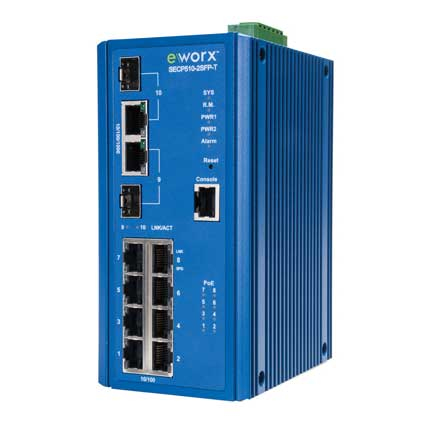 B&B Electronics SECP510-2SFP-T. Switch-Typ: gemanaged, MIB Unterstützung: Standard MIB, Private MIB. Basic Switching RJ-45 Ethernet Ports-Typ: Fast Ethernet (10/100), Konsolen-Port: RS-232, Kupfer Ethernet Verkabelungstechnologie: 10BASE-T,100BASE-TX,1000BASE-TX. Netzstandard: IEEE 802.1Q,IEEE 802.1ad,IEEE 802.1p,IEEE 802.1s,IEEE 802.1w,IEEE 802.1x,IEEE 802.3ab,IEEE 802.3af,I. MAC-Adressentabelle: 8000 Eintragungen, Routing-/Switching-Kapazität: 5,6 Gbit/s. Unterstützte Sicherheitsalgorithmen: HTTPS,PEAP,SSH,SSL/TLS,TTLS