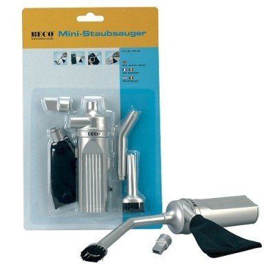 Mini-Staubsauger zum Reinigen von Tastaturen, Kameras, Mobiltelefonen, Platinen, u.a., batteriebetrieben, Blisterpackung.