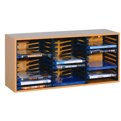 Holzregal für 33 Blu-Ray Boxen, mit Federmechanik, buche, Display-Karton
