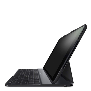 Strapazierfähiges Material bietet der Rückseite Ihres iPad Air Schutz und kommt auch als Standfuß zum Einsatz. Das extrem schlanke Gesamtprofil der Schutzhülle wird jedoch nicht beeinträchtigt. Wenn die Hülle geschlossen ist, bietet die Tastatur dem Tablet zusätzlichen Schutz an der Vorderseite.