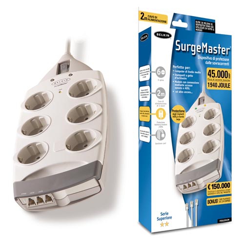 Belkin SurgeMaster. Überspannung Einschätzung: 1940 J, Nominale Eingang Spannung: 200-230. Kabellänge: 2 m. Produktfarbe: Weiß