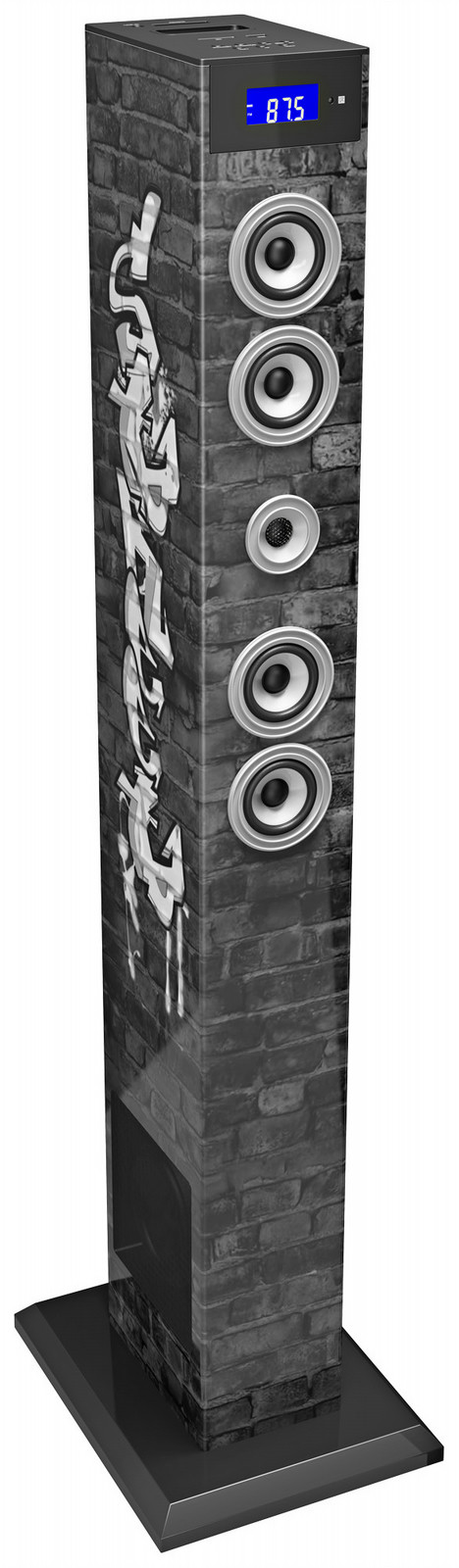 Bigben Interactive TW1STREET. Typ: Turm, Produktfarbe: Schwarz, Grau, Färbung: Bild. RMS-Leistung: 60 W, Subwoofer-Typ: Active subwoofer. Unterstützte Bänder: FM. Farbe der Hintergrundbeleuchtung: Blau, Display-Typ: LCD. Apple-Docking-Kompatibilität: iPhone,iPod