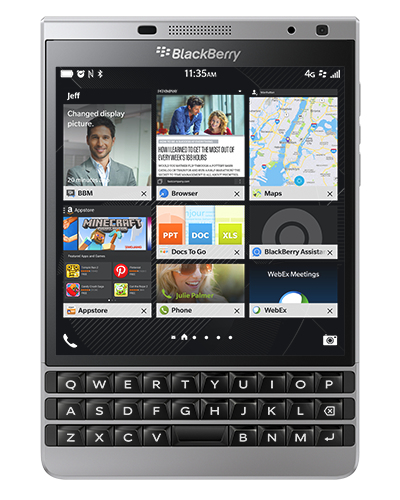 Das Design des BlackBerry® Passport™ unterscheidet sich von anderen Smartphones. Es verfügt über einen großen breiten Touchscreen und eine touchfähige Tastatur.