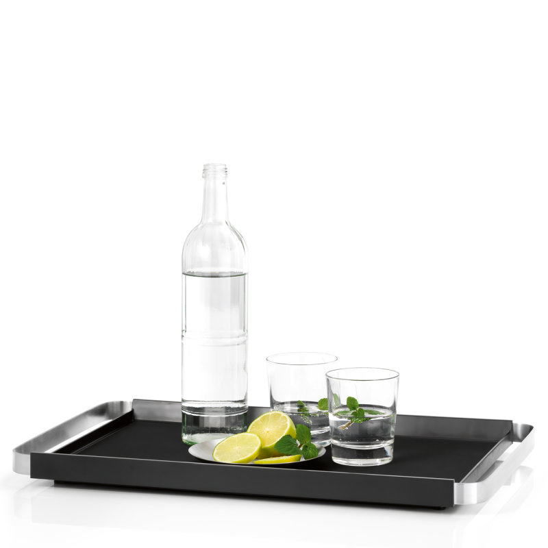 Die Materialkombination Edelstahl mit schwarzem Kunststoff lassen das Tablett sehr edel wirken. Praktisch ist die rutschhemmende Silikonauflage.