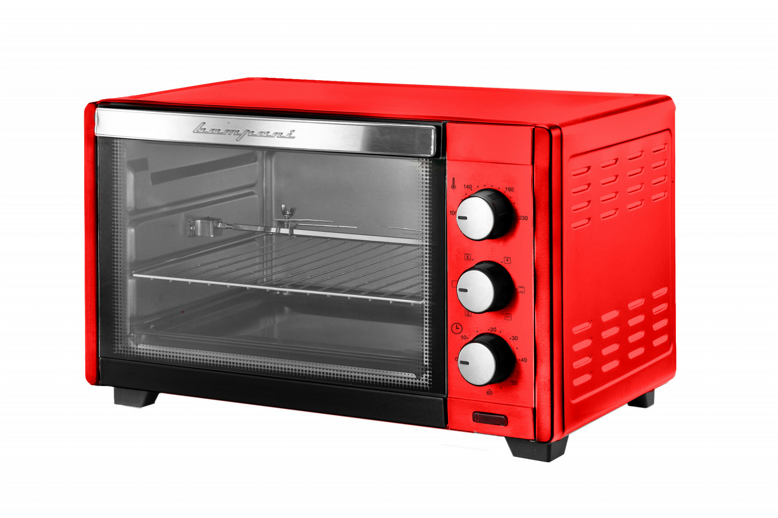 Bompani BOF20RA/E. Ofengröße: Klein, Ofentyp: Electric oven, Gesamtes Fassungsvermögen Garraum Ofen: 20 l. Produktfarbe: Rot, Kontrolltyp: Rotation, Kontrollposition: Vorderseite. Timer-Typ: Mechanisch, 99-Minuten-Timer: 60 min. Maximale Temperatur (konventionell): 230 °C. AC Eingangsspannung: 220-240 V, AC Eingangsfrequenz: 50/60 Hz