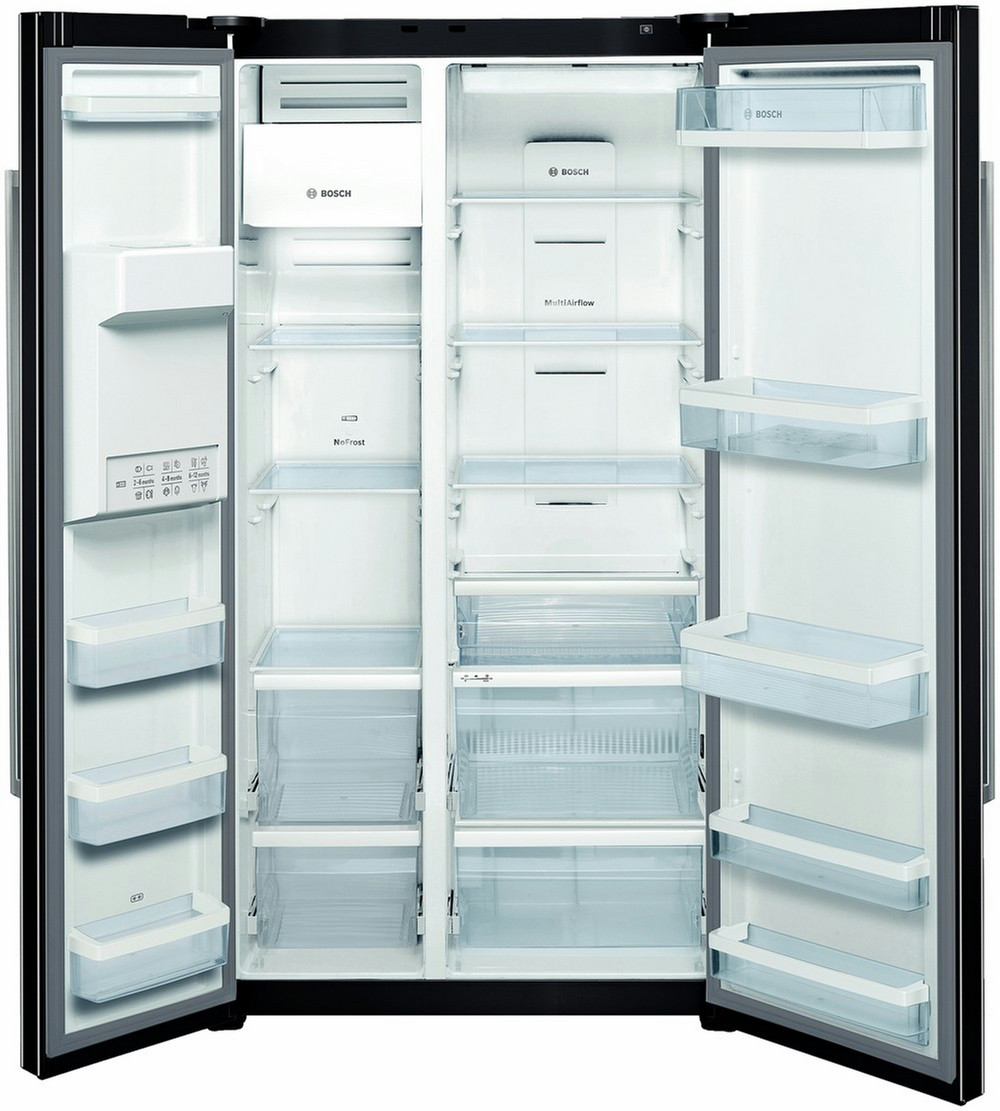 Bosch KAD62V50. Bauform: Freistehend, Produktfarbe: Schwarz. Netto Gesamtkapazität: 564 l. Kühlschrank - Nutzinhalt: 385 l, Kühlschrank - Bruttokapazität: 412 l, Kühlschrankstemperaturabstand: 4 - 8 °C. Gefrierfach - Nettokapazität: 179 l, Gefriervermögen: 12 kg/24h, Lagerzeit bei Störung: 16 h. Anschlusswert: 300 W, Jährlicher Energieverbrauch: 456,25 kWh, Energieverbrauch: 1,25 kWh/24h