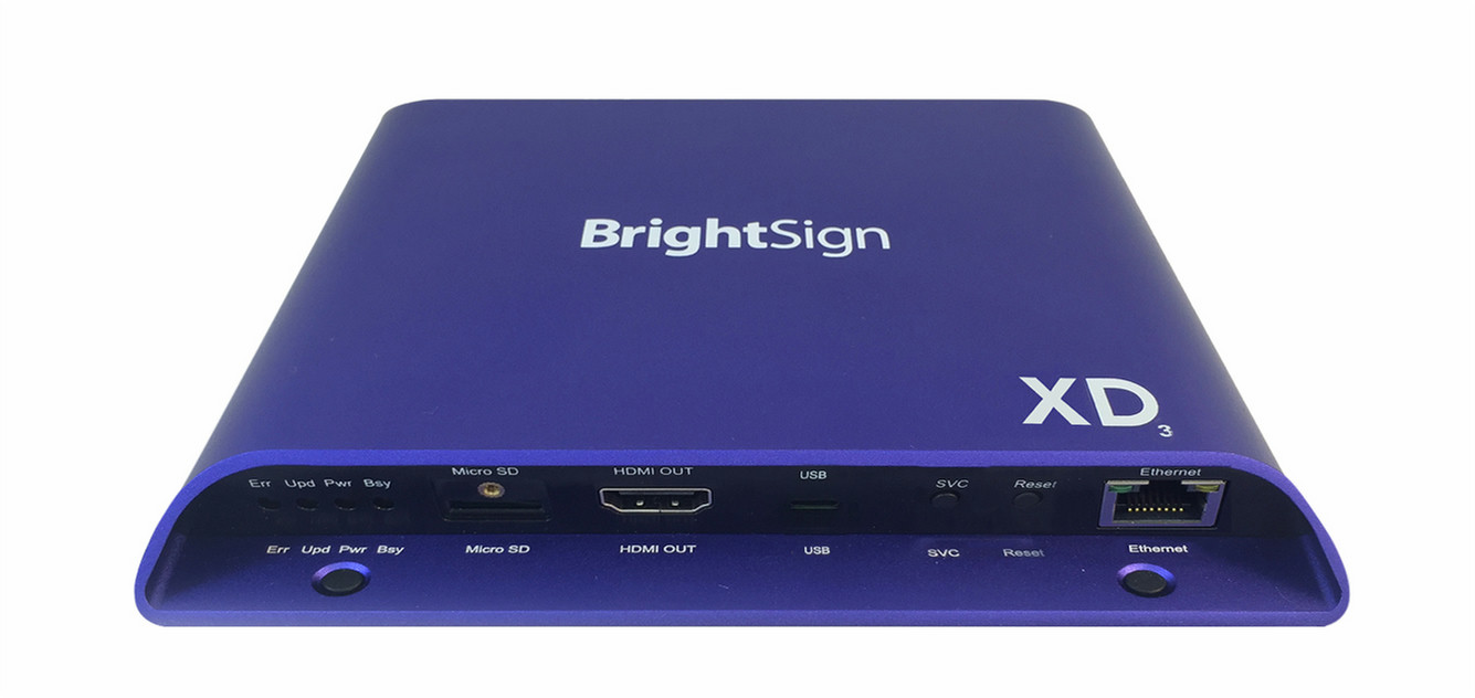 BrightSign XD1033. Produktfarbe: Blau. Speichermedien Typ: Flash, SSD, Speicherlaufwerk Schnittstelle: M.2, Kompatible Speicherkarten: SDHC,SDXC. Unterstützte Videoformate: H.264,H.265,MPEG1,MPEG2, Unterstützte Bildformate: BMP,JPS,PNG, Unterstützte Audioformate: AAC,FLAC,MP2,MP3,OGG,WAV. Maximale Video-Auflösung: 3840 x 2160 Pixel. HDMI-Version: 2.0a