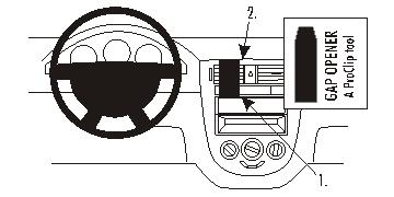 1. Das dünne Ende des beiliegenden "Gap Opener" zum Aufweiten in den Spalt zwischen dem Rahmen um das Autoradio und der Armaturentafel drücken. Die Schutzfolie vom Klebestreifen am ProClip entfernen.