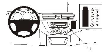 3. Den "Gap Opener" in den Spalt zwischen dem Armaturentafel-Rahmen und dem Armaturenbrett. Das mit Nut versehene untere Ende des ProClip in den Spalt über den "Gap Opener" drücken. So lange drücken, bis ein Einrasten zu hören/fühlen ist. Den "Gap Opener" herausziehen.