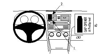 2. Die beiden "Gap Opener" in den Spalt zwischen dem Armaturenbrett und dem Lüftungsgitter-Rahmen drücken. Das obere Ende des ProClip Kopfplatte nach vorne drücken, und die obere linke Ecke nach unten drücken so dass sich die angewinkelte Kante in den Spalt neben den "Gap Openern" reingeht. So lange drücken, bis ein Einrasten zu hören/fühlen ist.