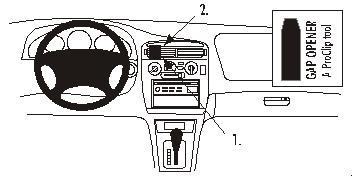 1. Das dünne Ende des beiligenden "Gap Opener" zum Aufweiten in den Spalt zwischen der Blende um die Lüftungsgitter und der Armaturentafel drücken. Die Schutzfolie vom Klebestreifen am ProClip entfernen