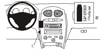 2. Die Schutzfolie vom Klebestreifen am ProClip entfernen. Das mit Nut versehene Ende des ProClip in den Spalt swischen den "Gap Openern" drücken. Den ProClip nach vorne sehr hart drücken, so dass er in den Spalt passt. Die "Gap Openers" entfernen.