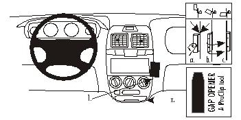 1. Das dünne Ende des beiliegenden "Gap Opener" zum Aufweiten in den Spalt zwischen dem Armaturenbrett und dem Armaturentafel bei Pos. x drücken. Den "Gap Opener" im Spalt nach oben verschieben, bis Pos. 1. Die Oberfläche bei Pos 1 mit dem beiliegenden Alkohol-Pad reinigen. Die Schutzfolie vom Klebestreifen am ProClip Montagestück (das kleinste Teil) entfernen.