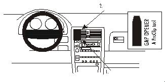 1. Das dünne Ende des beiliegenden "Gap Opener" zum Aufweiten in den Spalt zwischen der Armaturentafel und dem Lüftungsgitter-Rahmen drücken. Die mit Nut versehene Kante am unteren Ende des ProClip in den Spalt neben den "Gap Opener" drücken. Den "Gap Opener" herausziehen.