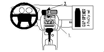 3. Den ProClip nun in Richtung Lenkrad schieben, bis der obere Teil an Pos. 2 in den Spalt gedrückt werden kann. Auch hier ist das Einrasten deutlich zu spüren/hören. Den "Gap-Opener" wieder herausziehen.