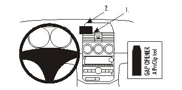 1. Das dünne Ende des beiliegenden "Gap Opener" zum Aufweiten in den Spalt zwischen der Blende um das Display und dem Armaturentafel drücken. Die Schutzfolie vom Klebestreifen am ProClip entfernen.