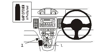 2. Das dünne Ende des beiligenden "Gap Opener" zum Aufweiten in den Spalt zwischen dem Rahmen um die Gangschaltung und dem Seitenwandt der Konsole drücken. Das linke Ende des ProClip in den Spalt neben den "Gap Opener" festhaken. Den "Gap Opener" herausziehen.