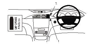 1. Das dünne Ende des beiligenden "Gap Opener" zum Aufweiten in den Spalt zwischen dem Rahmen um die Lüftungsgitter und das Armaturenbrett drücken. Die Schutzfolie von beiden Klebestreifen am ProClip entfernen.