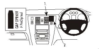 1. Das dünne Ende des beiliegenden "Gap Opener" zum Aufweiten in den Spalt zwischen dem Lüftungsgitter und dem umliegenden Rahmen drücken. Die Schutzfolie vom Klebestreifen am ProClip entfernen. Das mit Nut versehene oberen Ende des ProClip in den Spalt neben den "Gap Opener" drücken.