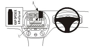 2. Das dünne Ende des beiliegenden "Gap Opener" zum Aufweiten in den Spalt zwischen dem Rahmen um das Lüftungsgitter und dem Autoradio drücken. Die Schutzfolie vom Klebestreifen am ProClip entfernen. Das untere Ende des ProClip in den Spalt neben den "Gap Opener" drücken, Den "Gap Opener" herausziehen.