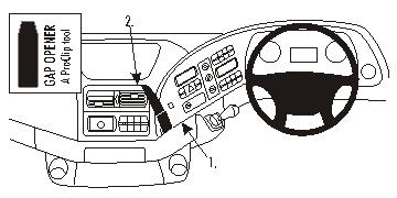 1. Das dünne Ende des beiliegenden "Gap Opener" zum Aufweiten in den Spalt zwischen dem Armaturenbrett und der Armaturetafel drücken. Die Schutzfolie vom Klebestriefen am ProClip entfernen.