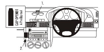 1. Das dünne Ende des beiliegenden "Gap Opener" zum Aufweiten in den Spalt zwischen dem Rahmen um der Armaturentafel und dem Armaturenbrett drücken. Die Schutzfolie vom Klebestreifen am ProClip entfernen.