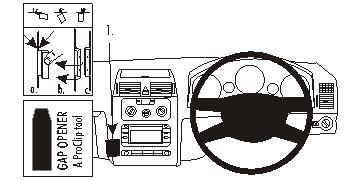 1. Das dünne Ende des beiligenden "Gap Opener" zum Aufweiten in den Spalt zwischen der Armaturenrafel und dem umliegenden Ramhen drücken. Die Schutzfolie vom Klebestreifen am Teil 1 entfernen. Teil 1 in den Spalt unter dem "Gap Opener" drücken.
